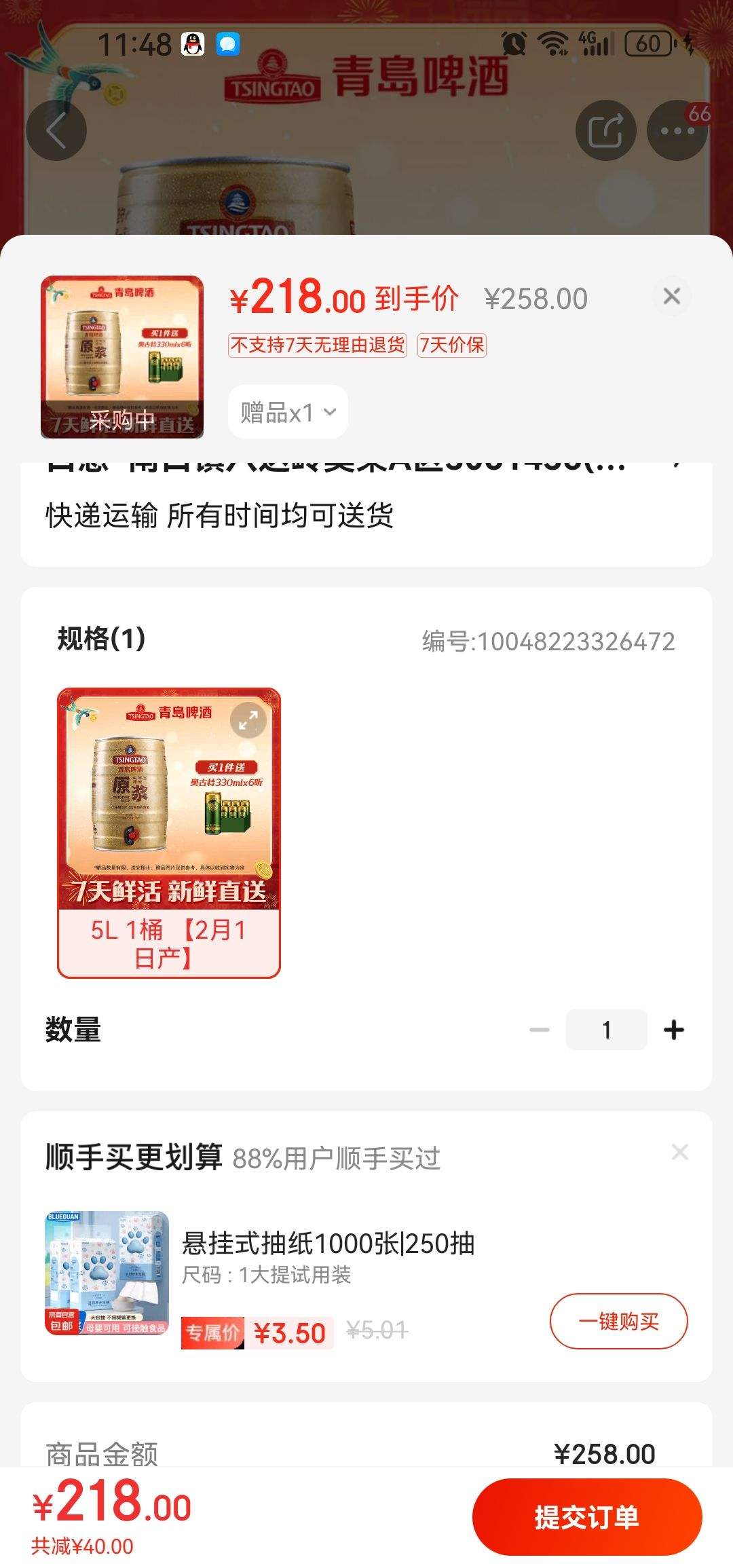 每满258减40,最高减1000元(1000)