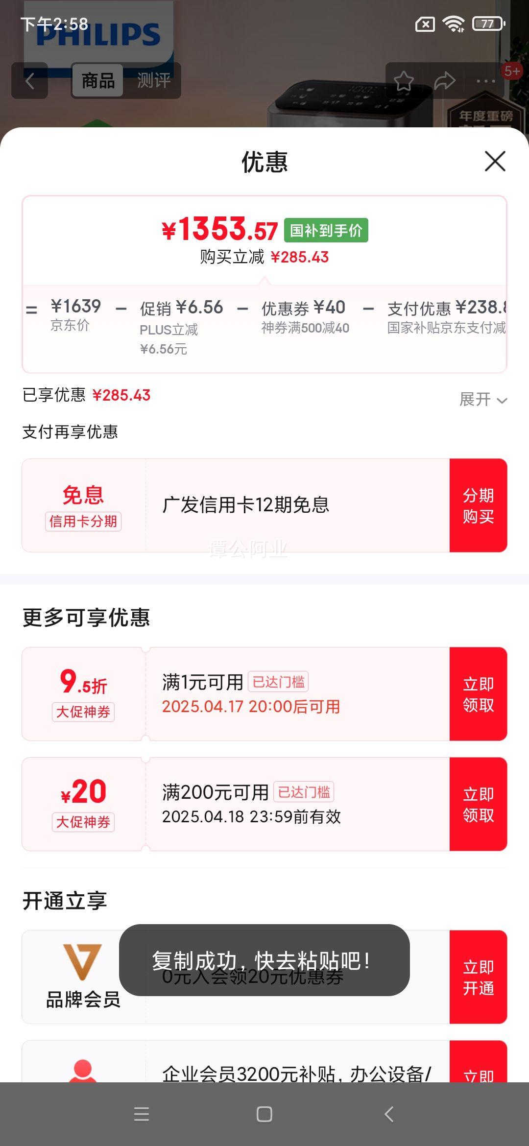 京东售价468元,PLUS叠加双重优惠立减266元,到手只需194元(需领卷)