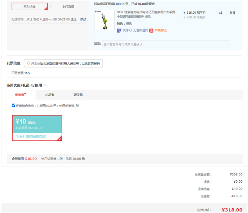 每满300减40,最高减400元