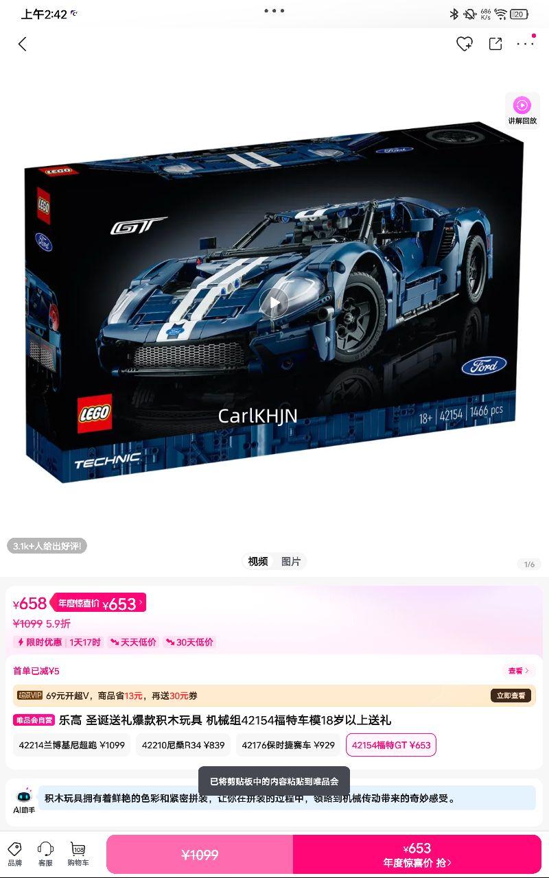 乐高 圣诞送礼爆款积木玩具 机械组42154福特车模18岁以上送礼658元
