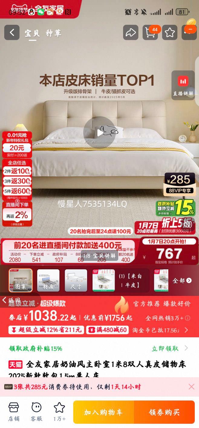 20点直播间前20名,下单1件,实付低至767元。