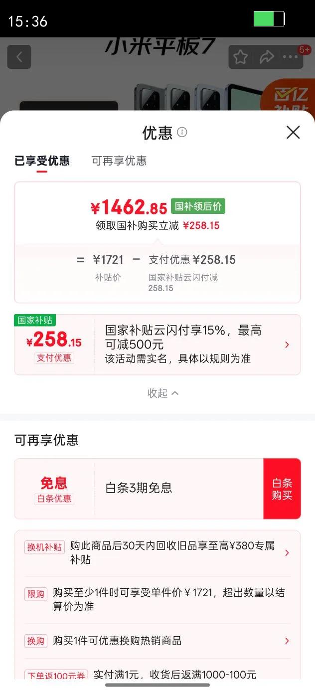 国补优惠15%