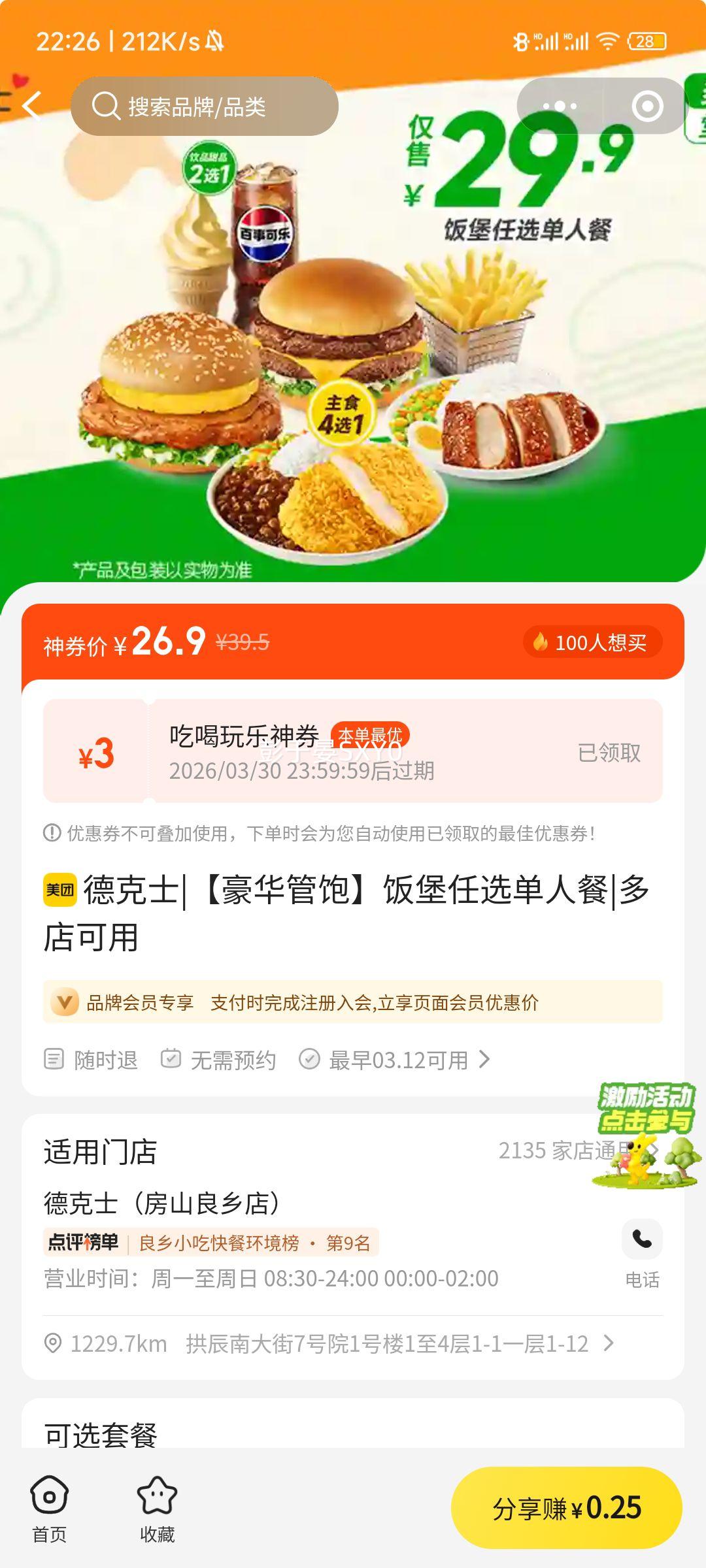 德克士 豪华管饱 饭堡任选单人餐29.9元