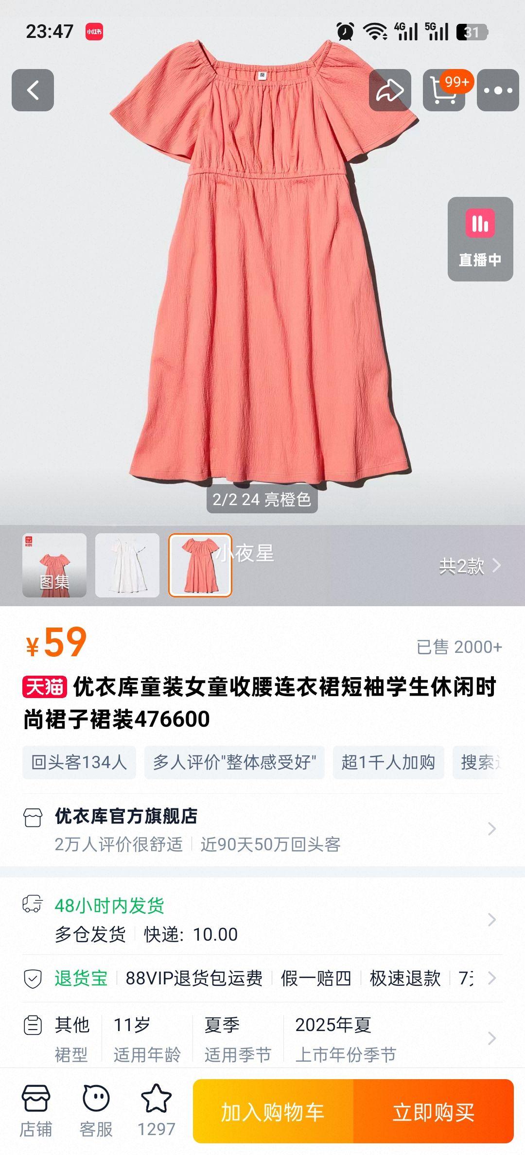 优衣库 女童收腰连衣裙 短袖 学生休闲时尚裙装 47660059元