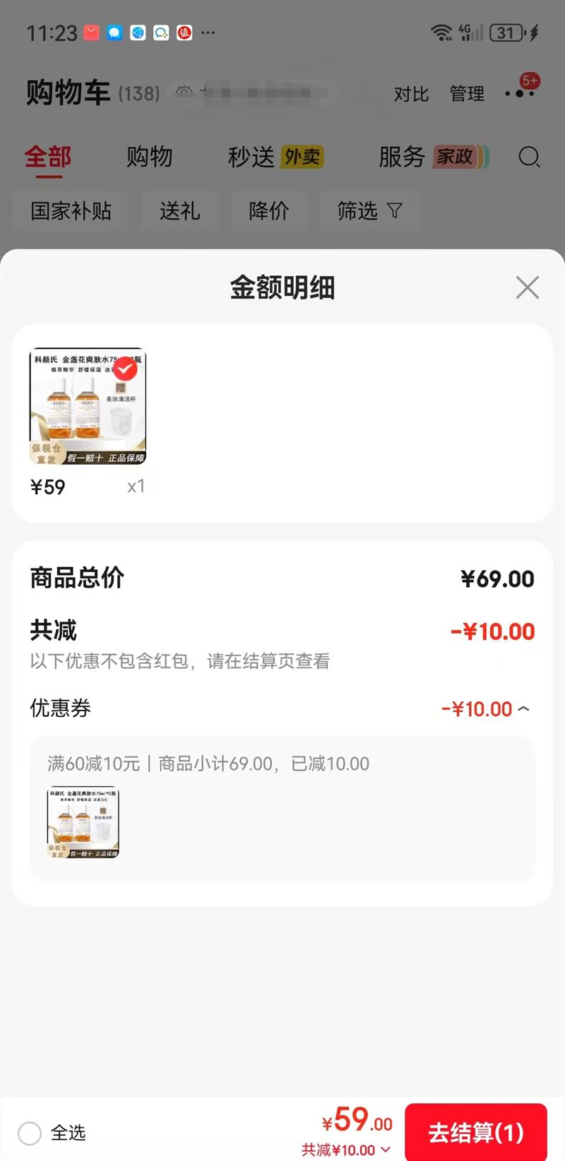 58.4元(合9.73元/件)