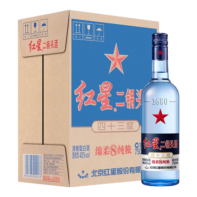 百亿补贴:红星二锅头43度蓝瓶绵柔8陈酿 清香型白酒 43度 750mL 6瓶 整箱装