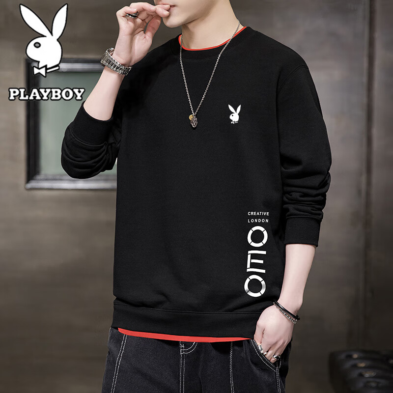 百亿补贴:花花公子长袖T恤男士春秋季卫衣休闲运动圆领长袖秋衣打底衫 黑色 XL