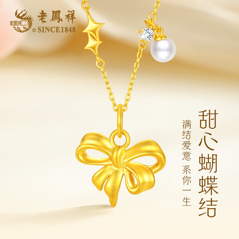 百亿补贴:老凤祥黄金项链女蝴蝶结足金吊坠纯金项链平安夜圣诞礼物送女友老婆生日 足金吊坠+久伴钟爱礼盒【赠S925链】