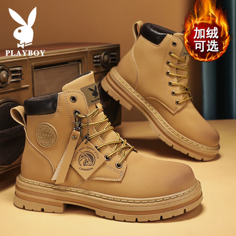 百亿补贴:花花公子马丁靴男鞋冬季2025新款大黄靴高帮加绒休闲复古工装内增高鞋子男 大黄靴 43 (265mm)